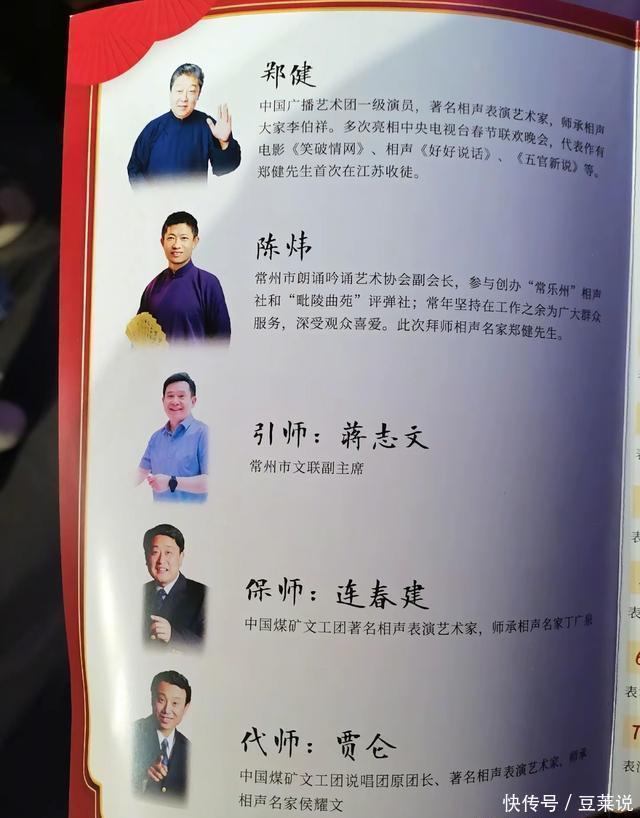 郑健收徒,陈炜拜师仪式,于前天在江苏苏州举办,姜昆弟子倪明担任主持人,引保代为蒋志文、连春建、贾仑。 蒋志文是苏州文联副主席,连春建是丁广泉的徒弟,贾仑是侯耀文的大徒弟。 下面的照片为收徒现场照片: 大屏幕照片: